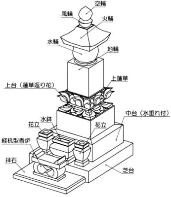 日本では平安時代末期から供養塔、供養墓として多く見られるようになり、 教理の上では、方形の地輪、円形の水輪、三角の火輪、半月型の風輪、団形の空輪から、地水火風空の五大を表すもので、宗派を超えて用いられており、墓石の本来の形と言われております。