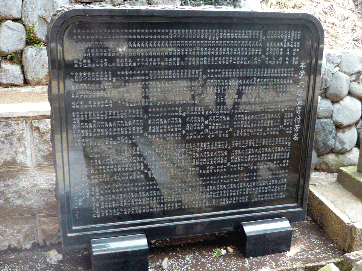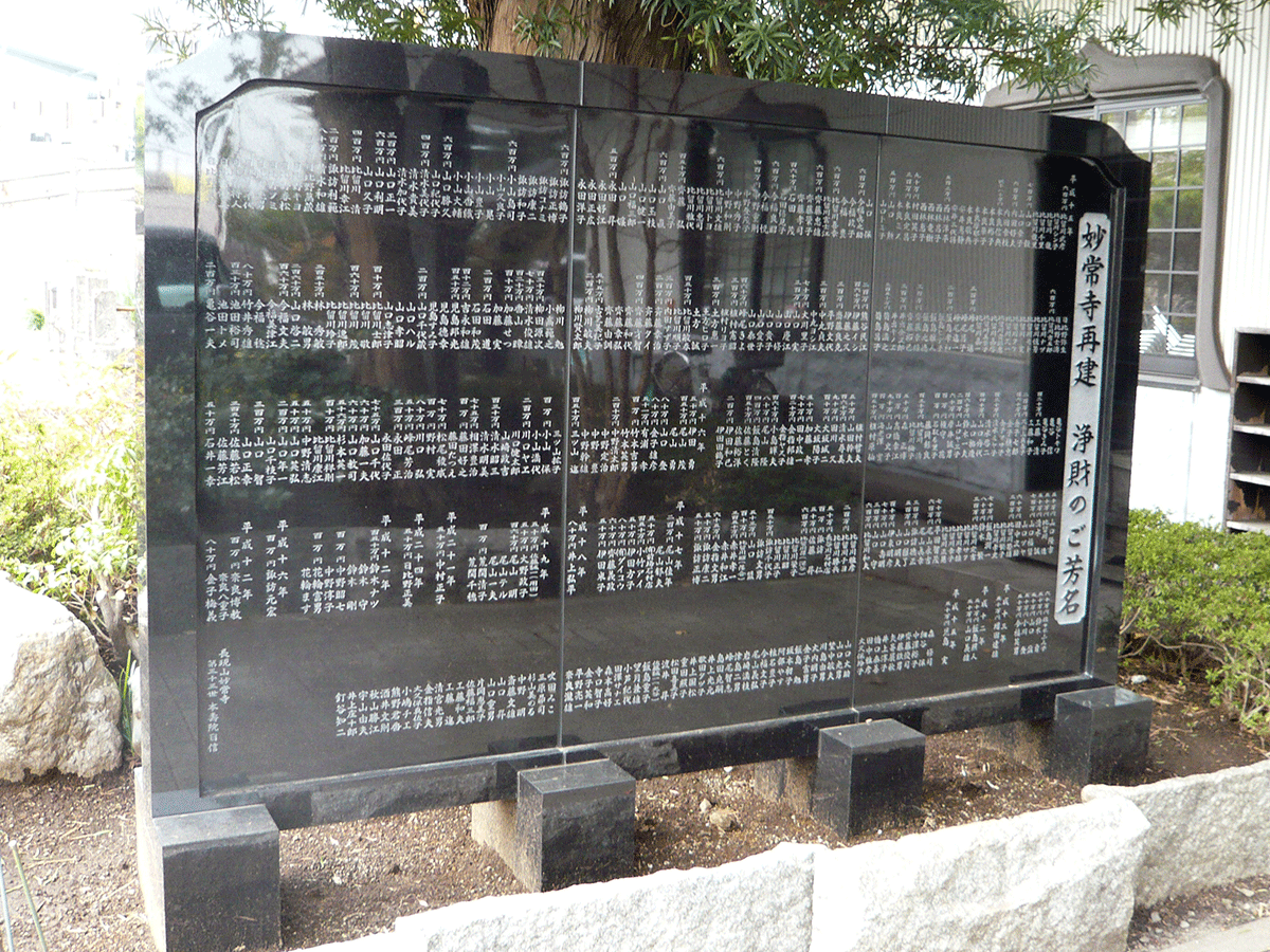 寺院の改築に寄付をいただいた方々の芳名碑を建立させていただきました。地震や台風などにも耐えられるように、基礎と土台と本体とを太い金属芯で留める耐震工法にて設置しております。